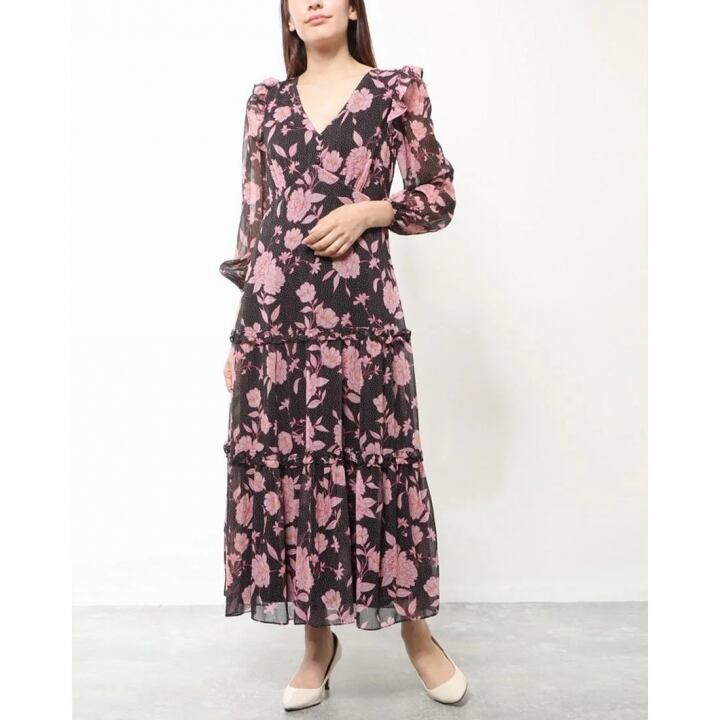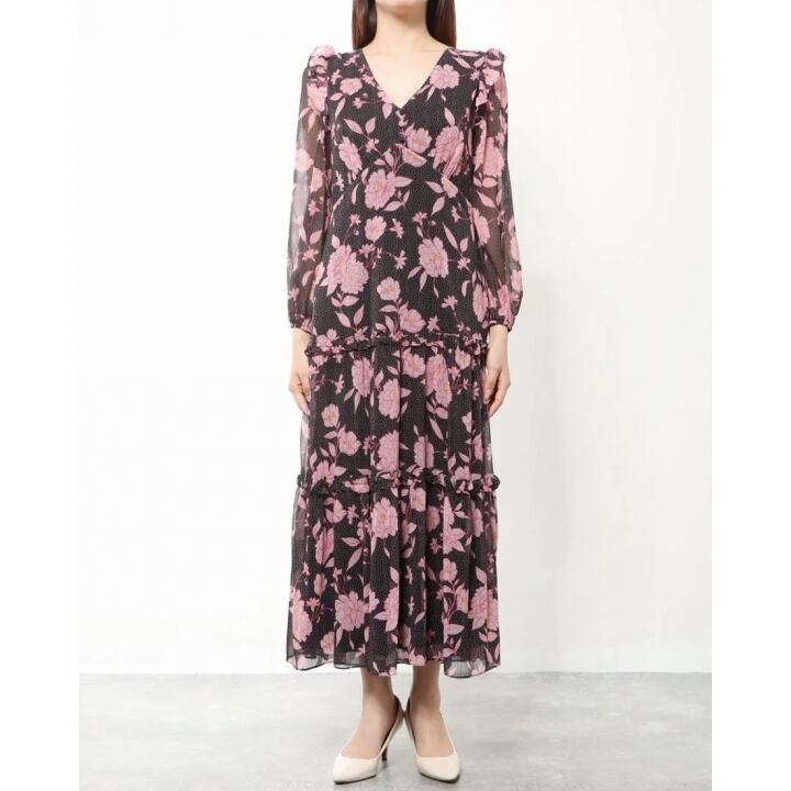 ダスク DUSK★欲しい!フェミニン大人の上品シフォンお洒落なピンクお花ドットワンピ♪